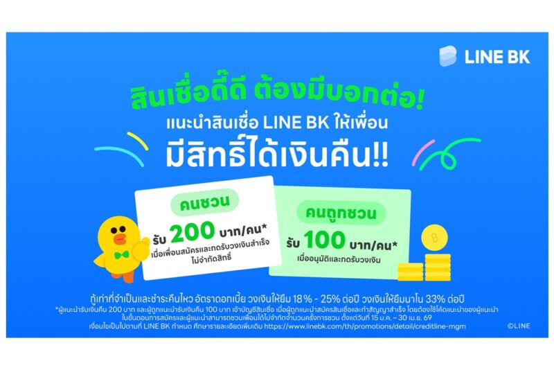 LINE BK เปิดแคมเปญ “สินเชื่อดี๊ดี ต้องมีบอกต่อ” ชวนผู้ใช้บริการสินเชื่อ* LINE BK แนะนำเพื่อนสมัครสินเชื่อผ่านโค้ดแนะนำ รับสิทธิ์เงินคืนเมื่อเพื่อนสมัครและทำรายการเบิกเงินสำเร็จ โดยผู้แนะนำสามารถรับเงินคืน 200 บาทต่อคน ชวนได้ไม่จำกัดสิทธิ์** ยิ่งชวนมาก ยิ่งได้มาก และผู้ถูกแนะนำรับเงินคืน 100 บาทต่อคน เริ่มแล้ววันนี้ – 30 เมษายน 2569