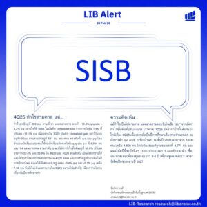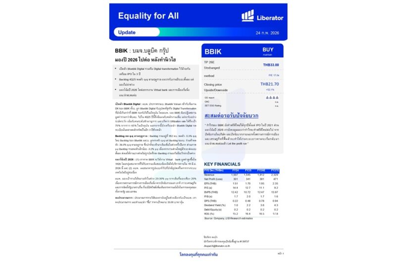 บทวิเคราะห์ “Equality for All” ประจำวันที่ 24 กุมภาพันธ์ 2569 โดย ผู้เขียน 3 SBN - 24 กุมภาพันธ์ 2026 FacebookTwitterLINE บทวิเคราะห์ “Equality for All” ประจำวันที่ 24 กุมภาพันธ์ 2569 Advertisement วันที่ 24 กุมภาพันธ์ 2569 บริษัทหลักทรัพย์ ลิเบอเรเตอร์ จำกัด หรือ “Liberator” (บล.ลิเบอเรเตอร์) ออกบทวิเคราะห์ประจำวันที่ 24 กุมภาพันธ์ 2569