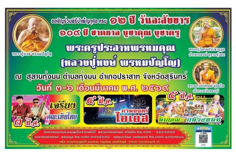 สุสานทุ่งมน จังหวัดสุรินทร์ เตรียมจัดงานน้อมรำลึก 109 ปีชาตกาล พระเดชพระคุณหลวงปู่หงษ์ พรหมปัญโญ พระเกจิอาจารย์สายอีสานใต้ อดีตเจ้าอาวาสวัดเพชรบุรี (สุสานทุ่งมน) ภายใต้แนวคิด “บูชาคุณ บูชาครู” พร้อมครบรอบ 12 ปี วันละสังขาร ระหว่างวันที่ 3–5 มีนาคม 2569 เพื่อเปิดโอกาสให้พุทธศาสนิกชนและศิษยานุศิษย์ร่วมทำบุญและรำลึกถึงคุณูปการทางพระพุทธศาสนา