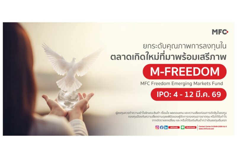 กองทุน “M-FREEDOM” ระดับความเสี่ยง 6 เสนอขายครั้งแรก (IPO) ระหว่างวันที่ 4-12 มีนาคม 2569 เงินลงทุนขั้นต่ำ 1,000 บาท ทั้งนี้ ผู้ลงทุนควรทำความเข้าใจลักษณะสินค้า เงื่อนไข ผลตอบแทน และความเสี่ยงก่อนการตัดสินใจลงทุน กองทุนป้องกันความเสี่ยงตามดุลยพินิจของผู้จัดการกองทุนอาจขาดทุน หรือได้รับกำไรจากอัตราแลกเปลี่ยน และ/หรือได้รับเงินคืนต่ำกว่าเงินลงทุนเริ่มแรก ผู้ที่สนใจสอบถามข้อมูลและขอรับหนังสือชี้ชวนได้ที่ บลจ.เอ็มเอฟซี จำกัด (มหาชน) และตัวแทนสนับสนุนการขาย หรือ โทรศัพท์ 0-2649-2000 ติดต่อฝ่ายวางแผนการลงทุน กด 2 หรือ Contact Center กด 0 สาขาแจ้งวัฒนะ โทร. 0-2835-3055-57 สาขาปิ่นเกล้า โทร. 0-2014-3150-2 สาขาขอนแก่น โทร. 043-204-014-16 สาขาเชียงใหม่ โทร. 0-5321-8480-82 สาขาระยอง โทร. 033-100-340 สาขาหาดใหญ่ โทร. 074-232-324-25 หรือที่ www.mfcfund.com