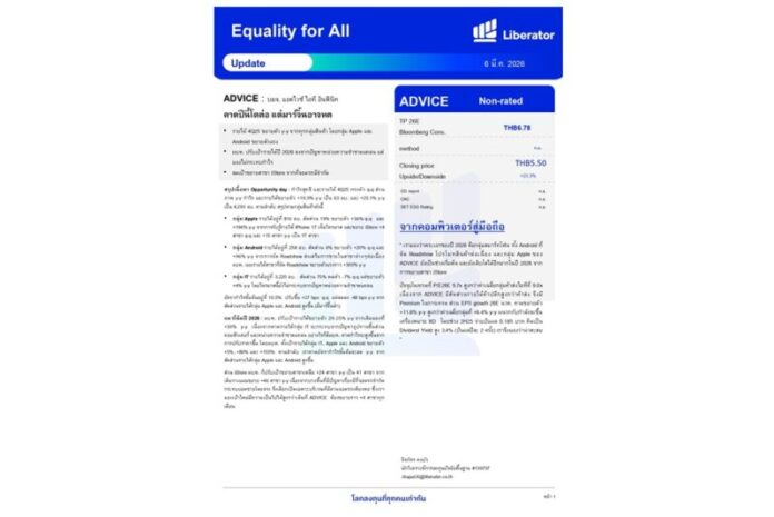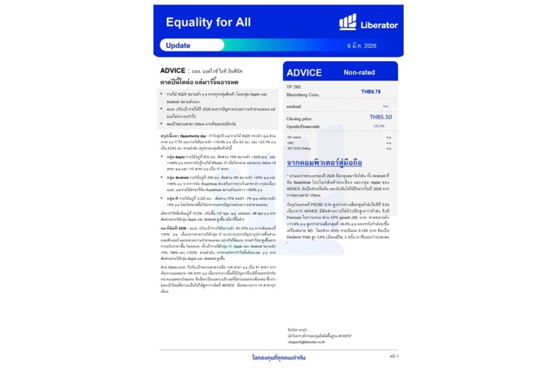 วันที่ 6มีนาคม 2569 บริษัทหลักทรัพย์ ลิเบอเรเตอร์ จำกัด หรือ “Liberator” (บล.ลิเบอเรเตอร์) ออกบทวิเคราะห์ประจำวันที่ 6 มีนาคม 2569