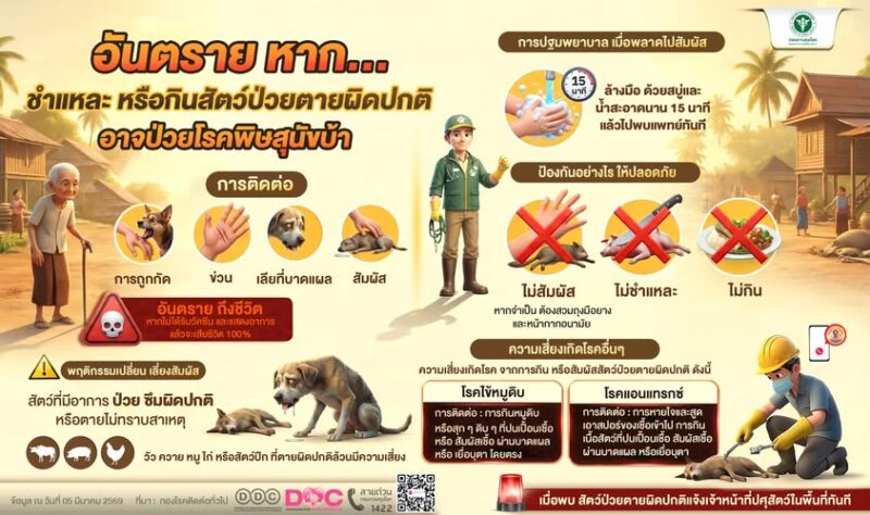 ทั้งนี้ เจ้าของสัตว์เลี้ยงควรนำสุนัขและแมวไปฉีดวัคซีนเป็นประจำทุกปี หากพบสัตว์สงสัยว่าเป็นโรค สามารถแจ้งปศุสัตว์ในพื้นที่ หรือสอบถามข้อมูลเพิ่มเติมได้ที่ สายด่วนกรมควบคุมโรค โทร. 1422 หรือ สายด่วนกรมปศุสัตว์ โทร 06-3225-6888 ตลอด 24 ชั่วโมง