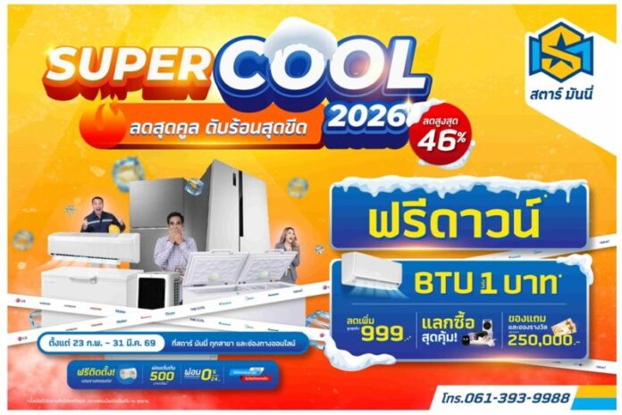 บมจ.สตาร์ มันนี่ (STARM) เปิดตัวแคมเปญ Star Money Super Cool 2026 ดับร้อน! ยกขบวนเครื่องใช้ไฟฟ้าลดแรงสูงสุด 46% ร้อนนี้ฟรีดาวน์* รับเครื่องก่อนผ่อนทีหลัง แอร์เริ่มต้น BTU ไม่ถึง 1 บาท* เย็นคุ้มทุกบาท ผ่อนสบายทุกเดือน พร้อมลุ้นของแถมของรางวัลมูลค่ารวมกว่า 250,000 บาท* เริ่มตั้งแต่วันนี้-31 มีนาคม 2569…. บอกเลยงานนี้จัดหนักจัดเต็ม สมฉายา “ราชาเงินผ่อนแห่งภาคตะวันออก” ของแท้!!!! โอกาสดี นาทีทอง ต้องรีบคว้า รีบจัดกันให้ไวไม่งั้นจะคุยกับใครไม่รู้เรื่องนะคร้าาา!!!