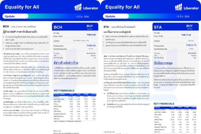 วันที่ 13 มีนาคม 2569 บริษัทหลักทรัพย์ ลิเบอเรเตอร์ จำกัด หรือ “Liberator” (บล.ลิเบอเรเตอร์) ออกบทวิเคราะห์ประจำวันที่ 13 มีนาคม 2569