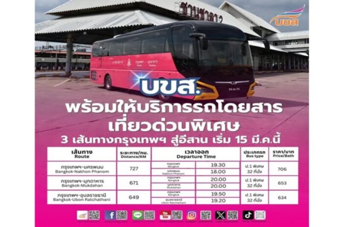 เร็วขึ้น 1 ชั่วโมงถึง 1 ชั่วโมง 30 นาที “บขส.” พร้อมให้บริการรถโดยสารเที่ยวด่วนพิเศษ 3 เส้นทางกรุงเทพฯ สู่อีสาน “นครพนม-มุกดาหาร-อุบลราชธานี” เริ่ม 15 มีนาคมนี้