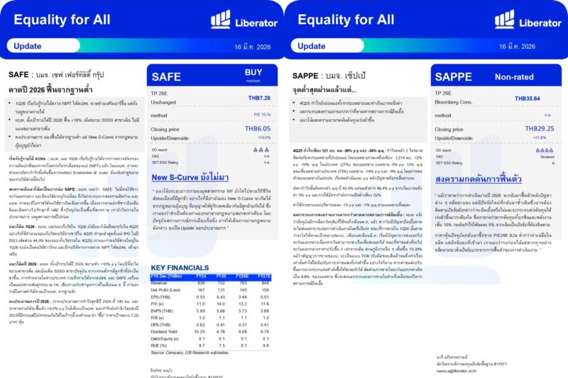 วันที่ 16 มีนาคม 2569 บริษัทหลักทรัพย์ ลิเบอเรเตอร์ จำกัด หรือ “Liberator” (บล.ลิเบอเรเตอร์) ออกบทวิเคราะห์ประจำวันที่ 16 มีนาคม 2569