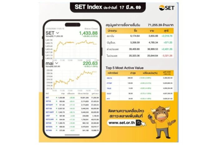 SET Index ประจำวันที่ 17 มี.ค.69 1,433.88 จุด +28.86 จุด มีมูลค่าซื้อขาย 71,255.39 ล้านบาท นักลงทุนต่างประเทศซื้อ +2,431.26 ล้านบาท mai Index ปิด 220.63 +2.83 มีมูลค่าซื้อขาย 323.90 ล้านบาท