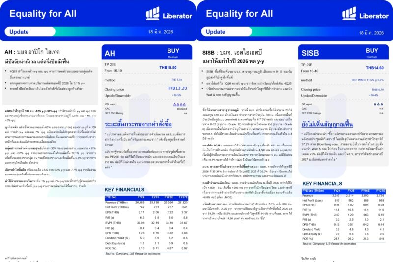 วันที่ 18 มีนาคม 2569 บริษัทหลักทรัพย์ ลิเบอเรเตอร์ จำกัด หรือ “Liberator” (บล.ลิเบอเรเตอร์) ออกบทวิเคราะห์ประจำวันที่ 18 มีนาคม 2569