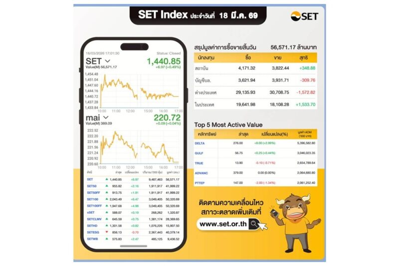 SET Index ประจำวันที่ 18 มี.ค.69 อยู่ที่ 1,440.85 จุด +6.97 มีมูลค่าซื้อขาย 56,571.17 ล้านบาท นักลงทุนต่างประเทศขาย -1,572.82 ล้านบาท mai Index ปิด 220.72 +0.09 มีมูลค่าซื้อขาย 389.09 ล้านบาท