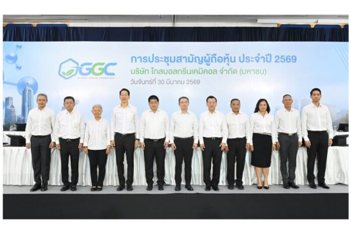 บริษัท โกลบอลกรีนเคมิคอล จำกัด (มหาชน) หรือ GGC นำโดย นายณะรงค์ศักดิ์ จิวากานันต์ (กลาง) ประธานกรรมการ พร้อมด้วยคณะกรรมการ และนายกฤษฎา ประเสริฐสุโข (ลำดับที่ 5 จากซ้าย) กรรมการผู้จัดการ ได้จัดการประชุมสามัญผู้ถือหุ้น ประจำปี 2569 ในรูปแบบการประชุมผ่านสื่ออิเล็กทรอนิกส์ (E-AGM) ของบริษัทฯ เพื่อชี้แจงถึงผลการดำเนินงานของบริษัทฯ ในรอบปี 2568 และแผนการเติบโตของบริษัทฯ ในอนาคต และได้อนุมัติเรื่องต่างๆ ตามกฎหมาย เช่น งบการเงินประจำปี การจ่ายเงินปันผล การแต่งตั้งกรรมการ เป็นต้น รวมทั้งการตอบข้อคำถามต่างๆ ของผู้ถือหุ้น โดยถ่ายทอดสดจากห้อง The Synergy Hall ชั้น 6 อาคาร C ศูนย์เอนเนอร์ยี่คอมเพล็กซ์