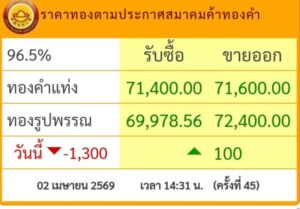 วันที่ 2 เมษายน 2569 สมาคมค้าทองคำแจ้งว่า เมื่อเวลา 14.30 น.ราคาทองปรับ 45ครั้ง ลง 1,300 บาทบาท