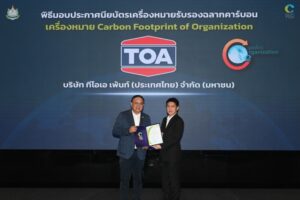 บริษัท ทีโอเอ เพ้นท์ (ประเทศไทย) จำกัด (มหาชน) หรือ TOA ผู้นำอุตสาหกรรมสีอันดับ 1 เคมีภัณฑ์ก่อสร้าง และวัสดุตกแต่งพื้นผิวของไทย ตอกย้ำความสำเร็จอย่างต่อเนื่องในการดำเนินธุรกิจควบคู่กับการดูแลสิ่งแวดล้อม เดินหน้าองค์กร Net Zero อย่างเป็นรูปธรรม ล่าสุดได้รับประกาศนียบัตร ‘การรับรองคาร์บอนฟุตพริ้นท์ขององค์กร (Carbon Footprint for Organization: CFO)’ โดยมี นายจตุภัทร์ ตั้งคารวคุณ ประธานเจ้าหน้าที่บริหาร TOA เข้ารับมอบประกาศนียบัตรจาก ดร.วิจารย์ สิมาฉายา ประธานกรรมการองค์การบริหารจัดการก๊าซเรือนกระจก (องค์การมหาชน) หรือ อบก. และมีนายณกรณ์ ตรรกวิรพัท ผู้อำนวยการ อบก. ร่วมแสดงความยินดี ณ สถาบันเพื่อการยุติธรรมแห่งประเทศไทย หรือ TIJ