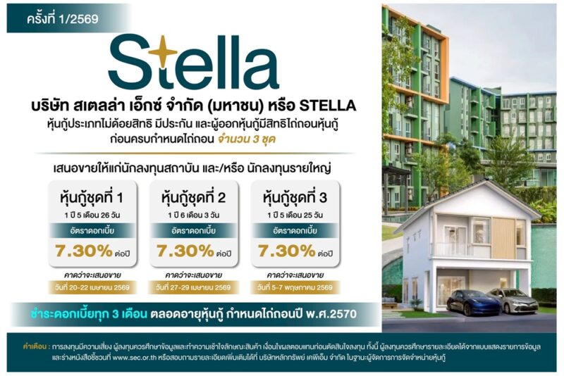 บมจ.สเตลล่า เอ็กซ์ (STELLA) เตรียมขายหุ้นกู้ 3 ชุดรวด แบบมีหลักประกัน รวมมูลค่าไม่เกิน 412 ล้านบาท พร้อมเสิร์ฟดอกเบี้ยสะใจ 7.30% ต่อปี!! เสนอขายสถาบันและนักลงทุนรายใหญ่ เปิดจองซื้อวันที่ 20 เม.ย. – 7 พ.ค.69 งานนี้ไม่ต้องห่วงเรื่องวินัยการเงิน เพราะที่ผ่านมาสามารถจ่ายดอกเบี้ย–เงินต้น ครบ ตรงเวลาเป๊ะทุกรุ่น ส่วนเงินที่ระดมทุนรอบนี้เตรียมนำไปเป็นเงินทุนหมุนเวียน พร้อมเคลียร์หุ้นกู้เดิมที่ครบกำหนด…