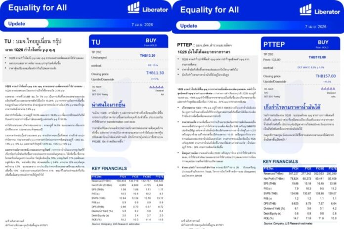 วันที่ 7 เมษายน 2569 บริษัทหลักทรัพย์ ลิเบอเรเตอร์ จำกัด หรือ “Liberator” (บล.ลิเบอเรเตอร์) ออกบทวิเคราะห์ประจำวันที่ 7 เมษายน 2569