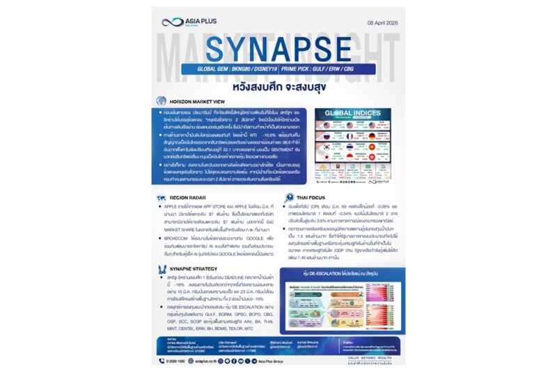 วันที่ 8 เมษายน 2569 บริษัทหลักทรัพย์ เอเซีย พลัส จำกัด ประเมินทิศทางตลาดการลงทุนว่ามีสัญญาณเชิงบวกอย่างชัดเจน ภายใต้ธีม “หวังสงบศึก จะสงบสุข” หลังจากที่สหรัฐฯ และอิหร่านสามารถบรรลุข้อตกลงหยุดยิงชั่วคราวเป็นเวลา 2 สัปดาห์ ก่อนที่เส้นตายการโจมตีครั้งใหญ่ของประธานาธิบดีโดนัลด์ ทรัมป์ จะสิ้นสุดลงเพียงไม่กี่ชั่วโมง โดยข้อตกลงนี้มีเงื่อนไขสำคัญคืออิหร่านต้องยอมเปิดเส้นทางเดินเรือผ่านช่องแคบฮอร์มุซอีกครั้ง ซึ่งมีประเทศปากีสถานเป็นตัวกลางในการเจรจา การผ่อนคลายความตึงเครียดดังกล่าว ส่งผลให้ราคาน้ำมันดิบโลกร่วงลงอย่างรุนแรงทันที โดยราคาน้ำมันดิบ WTI ปรับตัวลดลงถึง -16.6% ขณะเดียวกันก็เห็นสัญญาณเม็ดเงินไหลออกจากสินทรัพย์ปลอดภัยอย่างดอลลาร์สหรัฐ ทำให้ดัชนีดอลลาร์อ่อนค่าลงแตะระดับ 98.6 และหนุนให้เงินบาทแข็งค่าขึ้นมาอยู่ที่ 32.1 บาทต่อดอลลาร์ สถานการณ์นี้ถือเป็น Sentiment เชิงบวกต่อสินทรัพย์เสี่ยง และเป็นแรงหนุนให้เม็ดเงินไหลเข้าตลาดหุ้น โดยเฉพาะในแถบภูมิภาคเอเชีย อย่างไรก็ตาม ฝ่ายวิจัยเตือนว่ายังคงต้องติดตามสถานการณ์อย่างใกล้ชิด เพราะหากมีการละเมิดข้อตกลงหรือครบกำหนด 2 สัปดาห์ อาจเกิดการยกระดับความตึงเครียดและกดดันให้ตลาดกลับมาผันผวนได้อีกครั้ง