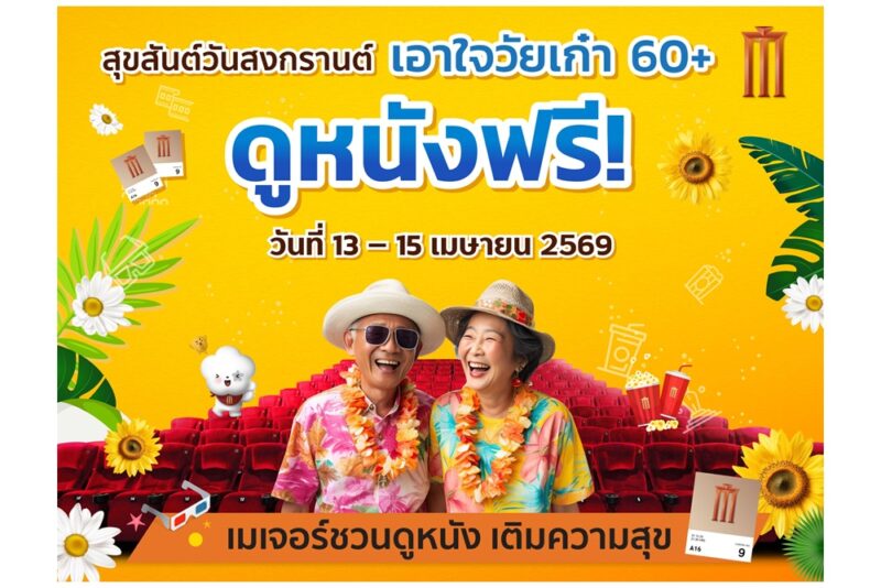 เมเจอร์ ซีนีเพล็กซ์ กรุ้ป ตอกย้ำความเป็นผู้นำด้านความบันเทิงที่ตอบโจทย์ทุกเจเนอเรชั่น เดินหน้าสร้างโมเมนต์แห่งความสุขให้ครอบครัวไทยในช่วงเทศกาลสงกรานต์และวันผู้สูงอายุแห่งชาติประจำปี 2569 ผ่านกิจกรรม “สุขสันต์วันสงกรานต์ เอาใจวัยเก๋า 60+ ดูหนังฟรี” มอบสิทธิ์รับชมภาพยนตร์ฟรี รวม 30,000 ที่นั่ง ที่โรงภาพยนตร์ในเครือเมเจอร์ ซีนีเพล็กซ์ ทุกสาขาทั่วประเทศ เพื่อสร้างรอยยิ้มและประสบการณ์สุดพิเศษให้กับผู้สูงอายุ ตั้งแต่วันที่ 13-15 เมษายนนี้