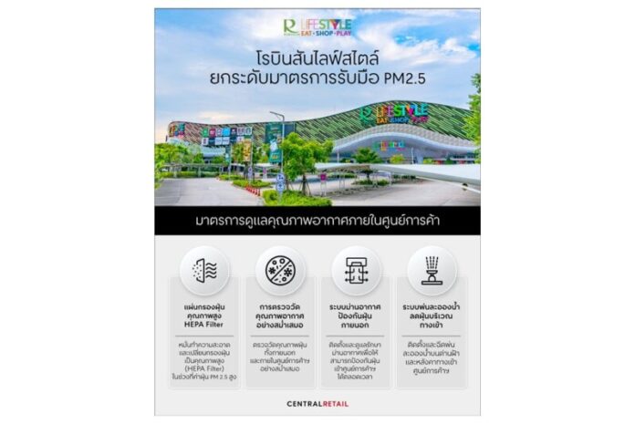 ศูนย์การค้าโรบินสันไลฟ์สไตล์ ในเครือเซ็นทรัล รีเทล ตระหนักถึงสถานการณ์ฝุ่น PM2.5 ที่ส่งผลกระทบในหลายพื้นที่ทั่วประเทศ และให้ความสำคัญกับการดูแลคุณภาพอากาศภายในศูนย์การค้าอย่างต่อเนื่อง ศูนย์การค้าฯ จึงเดินหน้ายกระดับมาตรการเชิงรุกเพื่อรับมือสถานการณ์ดังกล่าวอย่างรอบด้าน มุ่งสร้างความมั่นใจด้านสุขภาพ ความปลอดภัย และคุณภาพชีวิตที่ดีให้แก่ลูกค้า ผู้ใช้บริการ ร้านค้าในศูนย์การค้าฯ ตลอดจนชุมชนโดยรอบ สอดคล้องกับบทบาท Central to Life หรือศูนย์กลางชีวิตของทุกคน ที่มุ่งมั่นพัฒนาพื้นที่ให้พร้อมมอบประสบการณ์ที่ดี และเป็นส่วนหนึ่งในการใช้ชีวิตของผู้คนได้อย่างมั่นใจในทุกสถานการณ์