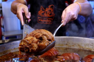• ร้านขาหมูงามวงศ์วาน โดดเด่นด้วยการตุ๋นขาหมูด้วยเครื่องเทศอย่างดี จนได้เนื้อสัมผัสเปื่อยนุ่มละลายในปาก หอมกลิ่นเครื่องพะโล้อ่อนๆ ชวนให้นึกถึงรสชาติความอร่อยแบบดั้งเดิม