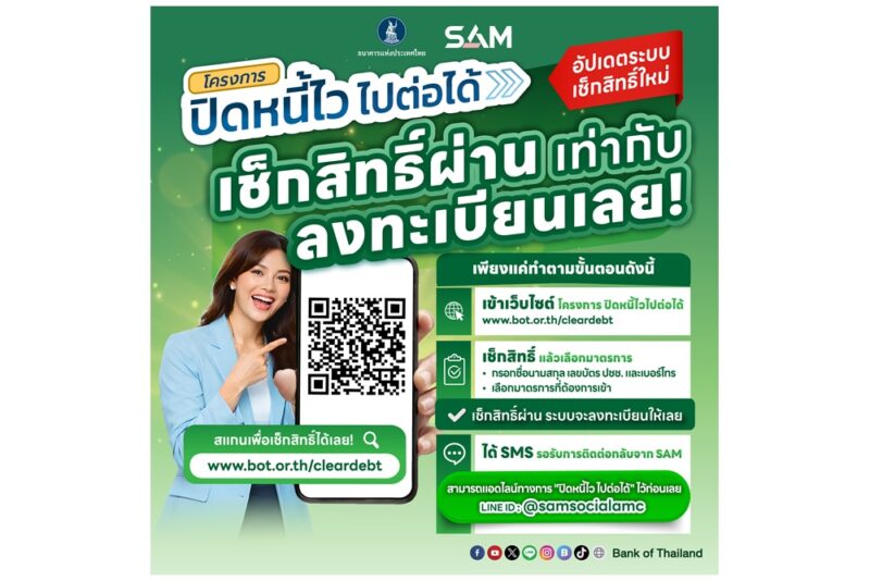 ทั้งนี้ ลูกหนี้สามารถตรวจสอบสิทธิ์เข้าร่วมโครงการได้ด้วยตนเอง แบบ “คลิกเดียวรู้ผลทันที” ผ่านช่องทางหลัก เว็บไซต์ ธนาคารแห่งประเทศไทย (ธปท.) www.bot.or.th/cleardebt และเว็บไซต์ บริษัท บริหารสินทรัพย์สุขุมวิท จำกัด www.sam.or.th เพียงกรอกข้อมูลส่วนตัว อาทิ ชื่อ-นามสกุล หมายเลขบัตรประชาชน หมายเลขโทรศัพท์ให้ครบถ้วน และหากลูกหนี้มีคุณสมบัติครบถ้วนตามเงื่อนไขทีกำหนด ระบบจะลงทะเบียนการเข้าร่วมโครงการให้โดยอัตโนมัติทันที! จากนั้นลูกหนี้จะได้รับการติดต่อผ่านทาง SMS จากธนาคารแห่งประเทศไทย และ SAM เพื่อยืนยันว่ามีคุณสมบัติตรงตามเงื่อนไขและสามารถเข้าร่วมโครงการได้ พร้อมระบุให้ลูกหนี้แอดไลน์ @samsocialamc และยืนยันตัวตน ซึ่งเป็นขั้นตอนสุดท้ายที่สำคัญ