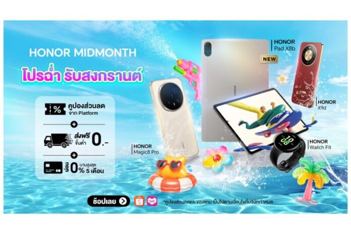 HONOR จัดเต็มรับสงกรานต์! ส่งแคมเปญ ‘HONOR MIDMONTH โปรฉ่ำ’ ลดสูงสุด 46% พร้อมโค้ดลดเพิ่ม 10,000 บาท และของแถมสุดเซอร์ไพรส์ 15-17 เม.ย.69