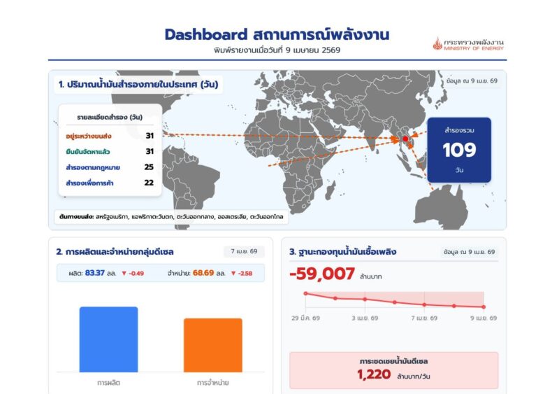 – ประมาณการฐานะกองทุนน้ำมันเชื้อเพลิง ณ วันที่ 9 เมษายน 2569 ติดลบ 59,007 ล้านบาท โดยมีการชดเชยน้ำมันดีเซลวันละประมาณ 1,220.61 ล้านบาท