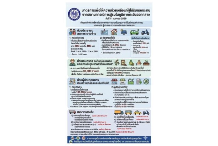 (นายเอกนิติฯ) เปิดเผยว่า คณะรัฐมนตรีได้มีมติเห็นชอบมาตรการให้ความช่วยเหลือแก่ผู้ที่ได้รับผลกระทบจากสถานการณ์การสู้รบในภูมิภาคตะวันออกกลาง เพื่อเป็นการบรรเทาผลกระทบและป้องกันความเสี่ยงทางเศรษฐกิจจากสถานการณ์ดังกล่าว ที่อาจส่งผลให้เกิดภาวะเศรษฐกิจชะลอตัวควบคู่กับอัตราเงินเฟ้อที่พุ่งสูงขึ้น (Stagflation) ซึ่งจะส่งผลกระทบต่อทุกภาคส่วน รัฐบาลจึงได้มี (1) มาตรการบรรเทาภาระค่าครองชีพของประชาชนกลุ่มเปราะบาง ภาคขนส่ง และเกษตรกร ท่ามกลางสถานการณ์ที่ยังมีความไม่แน่นอนสูง รวมทั้ง (2) มาตรการสนับสนุนให้ประชาชนและผู้ประกอบการปรับตัว (Transform) และหันมาใช้พลังงานสะอาดทดแทนน้ำมันให้มากขึ้น และมาตรการช่วยเหลือผู้ประกอบการและภาคการเกษตรที่เป็นต้นน้ำของห่วงโซ่อุปทาน (Supply Chain) ของประเทศ ให้ได้รับความช่วยเหลืออย่างทั่วถึง และมีสภาพคล่องเพียงพอต่อการดำเนินธุรกิจและการทำการเกษตร โดยรัฐบาลคาดหวังว่ามาตรการให้ความช่วยเหลือดังกล่าวจะเป็นการแบ่งเบาภาระและช่วยลดต้นทุนให้แก่ผู้ประกอบการและเกษตรกร ซึ่งจะช่วยลดการส่งผ่านภาระต้นทุนไปสู่ผู้บริโภค โดยคณะรัฐมนตรีได้มีมติเห็นชอบมาตรการเพื่อให้ความช่วยเหลือแก่ผู้ที่ได้รับผลกระทบจากสถานการณ์การสู้รบในภูมิภาคตะวันออกกลาง ดังนี้