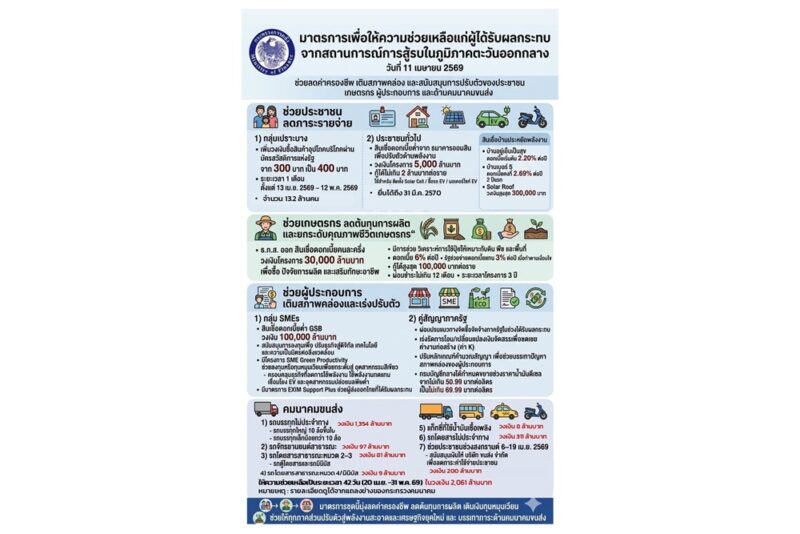 คลังจัดชุดใหญ่คลอดมาตรการให้ความช่วยเหลือประชาชนและผู้ประกอบการ ภาคขนส่ง เกษตรกร บรรเทาผลกระทบจากสถานการณ์การสู้รบในภูมิภาคตะวันออกกลาง ลดค่าครองชีพ-เติมสภาพคล่อง-ปรับตัวและหันมาใช้พลังงานสะอาดทดแทนน้ำมันให้มากขึ้น ลดการใช้งบประมาณหน่วยงานภาครัฐ ไม่ว่าจะเป็นงดการเดินทางไปศึกษาดูงาน-ฝึกอบรมในต่างประเทศ