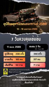 7 วันอันตรายสงกรานต์ 2569 วันที่ 2 ดับ 50 ราย รวมพุ่ง 71 ราย ขับเร็ว-ไม่สวมหมวก พฤติกรรมเสี่ยงอันดับ 1 จังหวัดที่มีผู้เสียชีวิตสะสมสูงสุด ปราจีนบุรี-พิษณุโลก จังหวัดละ 4 ราย ศปถ.กำชับจังหวัดดูแลความปลอดภัยทางถนนในพื้นที่เล่นน้ำสงกรานต์ บังคับใช้กฎหมายผู้มีพฤติกรรมเสี่ยงอุบัติเหตุทางถนน ห้ามขายแอลกอฮอล์ให้กับผู้ที่อายุต่ำกว่า 20 ปี