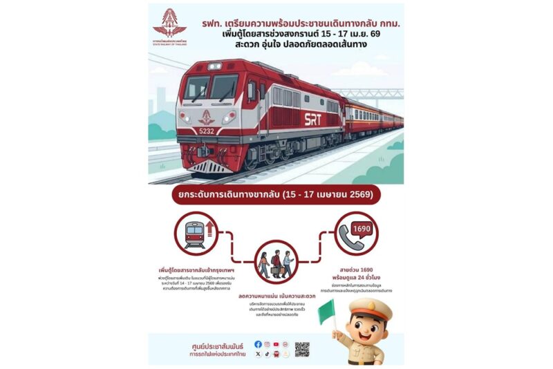 วันที่ 15 เมษายน 2569 การรถไฟแห่งประเทศไทย (รฟท.) เตรียมความพร้อมอย่างเต็มที่เพื่อรองรับการเดินทางของประชาชนในช่วงขากลับเข้าสู่กรุงเทพมหานครหลังเทศกาลสงกรานต์ โดยได้เตรียมการพ่วงตู้โดยสารเพิ่มเติมในขบวนรถที่มีผู้โดยสารหนาแน่นอย่างต่อเนื่องในช่วงวันที่ 15 – 17 เมษายน 2569 เพื่อรองรับปริมาณผู้โดยสารที่เพิ่มขึ้นภายหลังเทศกาลและจัดการการเดินทางได้อย่างมีประสิทธิภาพ อำนวยความสะดวกในการเดินทางให้เพียงพอต่อความต้องการของประชาชน และเนื่องจากมีผู้โดยสารจำนวนมาก จึงเพิ่มมาตรการดูแลความปลอดภัยของผู้โดยสาร โดยเฉพาะการดูแลผู้โดยสารในกรณีเกิดเหตุฉุกเฉินทางการแพทย์บนขบวนรถไฟ ด้วยการเตรียมความพร้อมทั้งด้านอุปกรณ์ บุคลากร และระบบประสานงาน เพื่อให้สามารถเข้าช่วยเหลือได้อย่างทันท่วงทีและมีประสิทธิภาพสูงสุด เช่น การแจ้งเหตุผ่านศูนย์บริการลูกค้าสัมพันธ์ รฟท. สายด่วน 1690 ตลอด 24 ชั่วโมง เพื่อประเมินสถานการณ์และประสานความช่วยเหลือได้อย่างรวดเร็วเมื่อเกิดเหตุฉุกเฉิน