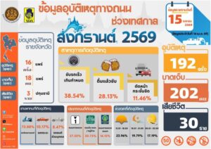 วันที่ 15 เมษายน 2569 ที่กรมป้องกันและบรรเทาสาธารณภัย (ปภ.) ศูนย์อำนวยการความปลอดภัยทางถนน (ศปถ.) แถลงสรุปสถิติอุบัติเหตุทางถนนช่วงเทศกาลสงกรานต์ 2569 ประจำวันที่ 14 เมษายน 2569 เกิดอุบัติเหตุ 192 ครั้ง ผู้บาดเจ็บ 202 คน ผู้เสียชีวิต 30 ราย สรุปอุบัติเหตุทางถนนสะสมในช่วง 5 วัน ของการรณรงค์ (10 – 14 เม.ย. 69) เกิดอุบัติเหตุรวม 951 ครั้ง ผู้บาดเจ็บ รวม 911 คน ผู้เสียชีวิต รวม 191 ราย ศปถ. สั่งบูรณาการทุกหน่วยงานเตรียมรับมือประชาชนเดินทางกลับ เน้นตรวจความพร้อมรถโดยสารสาธารณะและคนขับอย่างเข้มงวด พร้อมบังคับใช้กฎหมายขั้นเด็ดขาด “ดื่มแล้วขับ จับจริง” นำผู้กระทำผิดเข้าสู่กระบวนการคุมประพฤติ ควบคู่กับการคุมเข้มการจำหน่ายแอลกอฮอล์แก่เยาวชนและป้องปรามพฤติกรรมเสี่ยงทุกพื้นที่