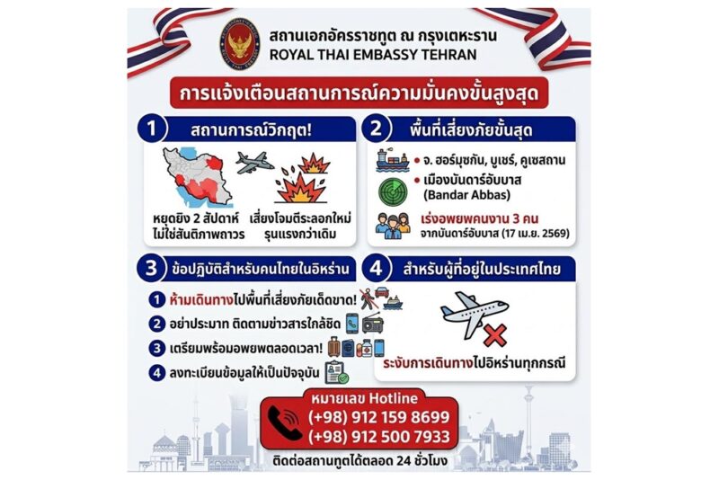 วันที่ 15 เมษายน 2569 กรมการกงสุล กระทรวงการต่างประเทศ ประกาศแจ้งเตือนสถานการณ์ความมั่นคงขั้นสูงสุด จากสถานเอกอัครราชทูต ณ กรุงเตหะราน