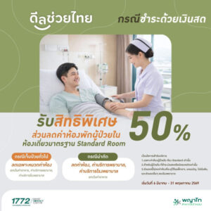 •สิทธิประโยชน์ค่าห้องพัก: ลดสูงสุด 50% พร้อมทีมดูแลส่วนต่างประกัน เพื่อให้คนไข้ “ไม่ต้องจ่ายเพิ่ม”