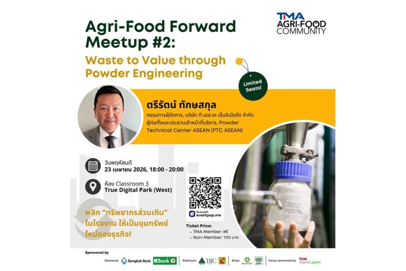 สมาคมการจัดการธุรกิจหแห่งประเทศไทย (TMA) จึงจัด “Agri-Food Forward Meetup #2 – Waste to Value through Powder Engineering” ครั้งที่ 2 เพื่อปลดล็อก “ทรัพยากรส่วนเกิน” จากกระบวนการผลิตที่ซ่อนอยู่ในอุตสาหกรรมอาหาร โภชนาการ และเทคโนโลยีชีวภาพ ด้วยเทคโนโลยี Powder Engineering ที่เปลี่ยน “Waste” ให้กลายเป็นสินค้าที่มีมูลค่าสูง (High-Value Ingredients) ได้จริงในเชิงอุตสาหกรรม โดย คุณตรีรัตน์ ทักษสกุล กรรมการผู้จัดการ บริษัท ที.เอส.เค. เอ็นจิเนียริ่ง จำกัด และผู้ก่อตั้ง PTC ASEAN ผู้มีประสบการณ์ในด้านการพัฒนาและสร้างระบบกระบวนการผลิตระดับอุตสาหกรรมในหลากหลายสาขากว่า 20 ปี มาให้ความรู้เพื่อนำไปพัฒนาและต่อยอดได้ในอนาคต