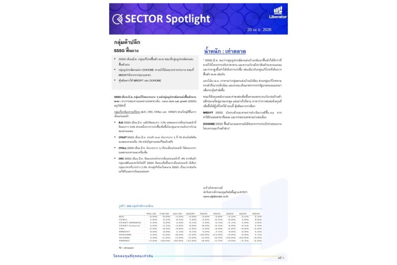 วันที่ 20 เมษายน 2569 บริษัทหลักทรัพย์ ลิเบอเรเตอร์ จำกัด หรือ “Liberator” (บล.ลิเบอเรเตอร์) ออกบทวิเคราะห์ประจำวันที่ 20 เมษายน 2569