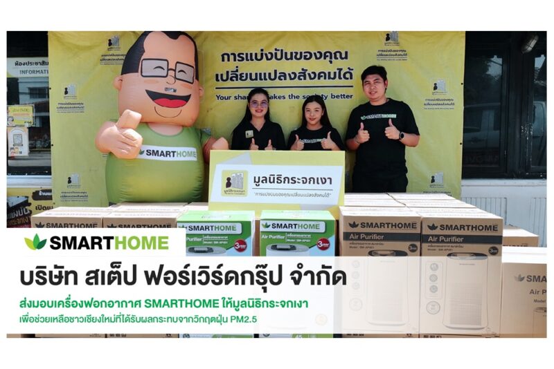 บริษัท สเต็ป ฟอร์เวิร์ด กรุ๊ป จำกัด ผู้จัดจำหน่ายเครื่องใช้ไฟฟ้าภายใต้แบรนด์ SMARTHOME (สมาร์ทโฮม) ส่งมอบเครื่องฟอกอากาศแบรนด์ SMARTHOME ให้แก่มูลนิธิกระจกเงา เพื่อเป็นส่วนหนึ่งในการช่วยเหลือประชาชนในพื้นที่จังหวัดเชียงใหม่และภาคเหนือ ที่กำลังเผชิญกับสถานการณ์วิกฤตฝุ่นละอองขนาดเล็ก PM2.5 ซึ่งส่งผลกระทบต่อสุขภาพในชีวิตประจำวันอย่างต่อเนื่อง โดยเฉพาะในกลุ่มเปราะบางที่ต้องการการดูแลเป็นพิเศษ