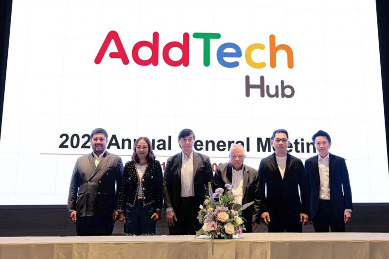นายจิรพันธ์ สินธุนาวา (กลางขวา) ประธานกรรมการบริษัท นายชวัล บุญประกอบทรัพย์ (ขวา) ประธานเจ้าหน้าที่บริหาร พร้อมด้วย คณะกรรมการบริษัท แอดเทค ฮับ จำกัด (มหาชน) หรือ ADD ผู้ดำเนินธุรกิจให้บริการดิจิทัลคอนเทนต์และให้บริการดิจิทัลโซลูชัน ร่วมประชุมสามัญผู้ถือหุ้นประจำปี 2569 ผ่านสื่ออิเล็กทรอนิกส์ (E-AGM) โดยที่ประชุมผู้ถือหุ้นมีมติอนุมัติจ่ายเงินปันผลจากผลการดำเนินงานปี 2568 เพิ่มเติมในอัตรา 0.09 บาทต่อหุ้น โดยกำหนดจ่ายเงินปันผลในวันที่ 5 พฤษภาคม 2569 ส่วนแผนธุรกิจในปี 2569 เดินหน้าโฟกัสธุรกิจหลักด้านการพัฒนาระบบสำคัญ เช่น ระบบโหวตแคมเปญระดับประเทศ, ระบบเสียงรอสายรูปแบบใหม่ และระบบแลกคะแนนสะสม (Point Redemption) สำหรับสถาบันการเงินและองค์กรใหญ่ เพื่อสร้างรายได้มั่นคง พร้อมปรับโครงสร้างเพื่อลดความเสี่ยง ทำให้การเงินแข็งแรงและพร้อมเติบโตอย่างยั่งยืน