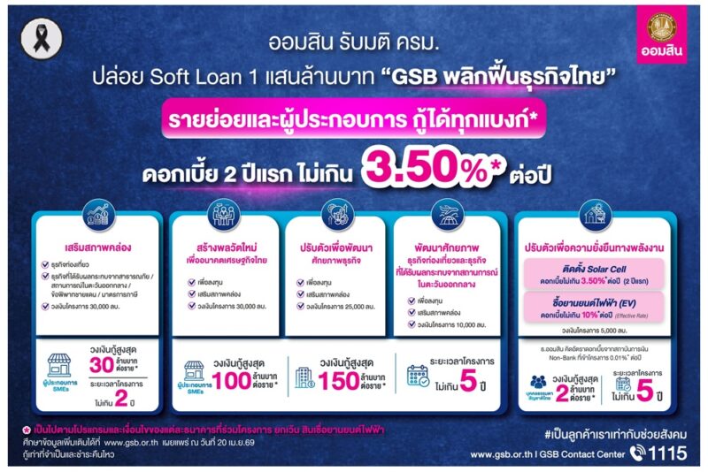 วันที่ 20 เมษายน 2569 นายทรงพล ชีวะปัญญาโรจน์ ผู้อำนวยการธนาคารออมสิน เปิดเผยว่า ตามมติคณะรัฐมนตรี เมื่อวันที่ 11 เมษายน 2569 เห็นชอบการออกมาตรการดูแลผู้ที่ได้รับผลกระทบจากสถานการณ์วิกฤตพลังงาน ความไม่แน่นอนทางเศรษฐกิจและความขัดแย้งในต่างประเทศ โดยมอบหมายให้ธนาคารออมสินเป็นแกนหลักในการขับเคลื่อนมาตรการทางการเงินเพื่อเติมสภาพคล่องผ่าน โครงการสินเชื่อดอกเบี้ยต่ำ (Soft Loan) “GSB พลิกฟื้นธุรกิจไทย” วงเงิน 100,000 ล้านบาท มุ่งช่วยประชาชนและผู้ประกอบการ SMEs ปรับตัวรับมือวิกฤตที่ส่งผลกระทบต่อการดำรงชีวิตและการดำเนินธุรกิจ พร้อมสนับสนุนการเปลี่ยนผ่านสู่การใช้พลังงานทางเลือก โดยความร่วมมือของธนาคารพาณิชย์และสถาบันการเงินเฉพาะกิจทั้ง 16 แห่ง ในการส่งผ่านเงินทุนดอกเบี้ยต่ำไปยังกลุ่มเป้าหมายให้เร็วที่สุด