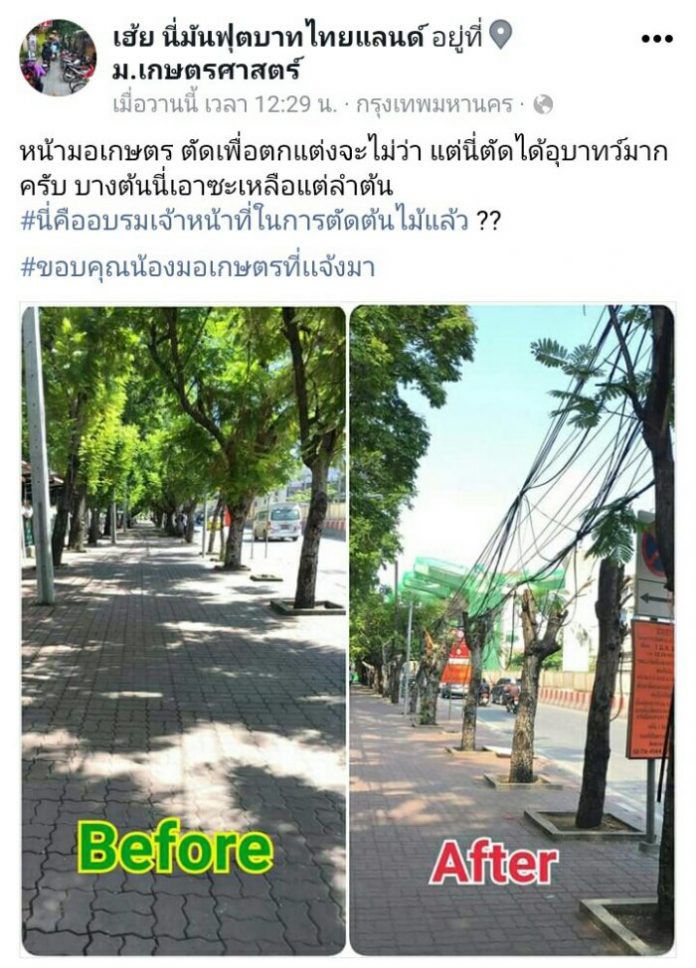 ทั้งนี้ จากการตรวจสอบพบว่า ทางบริษัทฯ ได้เข้าตัดต้นไม้บริเวณหน้า มหาวิทยาลัยเกษตรศาสตร์ จนสั้น เพื่อให้บริเวณนั้นเป็นแนวสายสื่อสาร จำนวน 2 ช่วง คือ ช่วงหน้า ม.เกษตรฯ จำนวน 9 ต้น และช่วงหน้า ธ.ออมสิน สาขา ม.เกษตรฯ จำนวน 5 ต้น