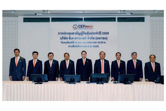 บริษัท ซีเค พาวเวอร์ จำกัด (มหาชน) หรือ CKPower (ชื่อย่อหลักทรัพย์: CKP) หนึ่งในผู้นำในการผลิตไฟฟ้าจากพลังงานหมุนเวียนที่ใหญ่ที่สุดในภูมิภาคและมีคาร์บอนฟุตพรินต์ต่ำที่สุดรายหนึ่ง จัดประชุมสามัญผู้ถือหุ้น ประจำปี 2569 ในรูปแบบการประชุมผ่านสื่ออิเล็กทรอนิกส์ (E-AGM) เมื่อวันที่ 23 เมษายน 2569 โดยที่ประชุมรับทราบผลการดำเนินงานประจำปี 2568 และมีมติอนุมัติจ่ายเงินปันผลสำหรับงวดผลการดำเนินงานปี 2568 ในอัตราหุ้นละ 0.088 บาท รวมเป็นจำนวนเงินทั้งสิ้นไม่เกิน 715 ล้านบาท โดยกำหนดให้จ่ายเงินปันผลให้กับผู้ถือหุ้นที่มีสิทธิได้รับเงินปันผลตามที่ปรากฏชื่อ ณ วันกำหนดสิทธิผู้ถือหุ้น (Record Date) ในวันที่ 8 พฤษภาคม 2569 และมีกำหนดจ่ายเงินปันผลในวันที่ 22 พฤษภาคม 2569