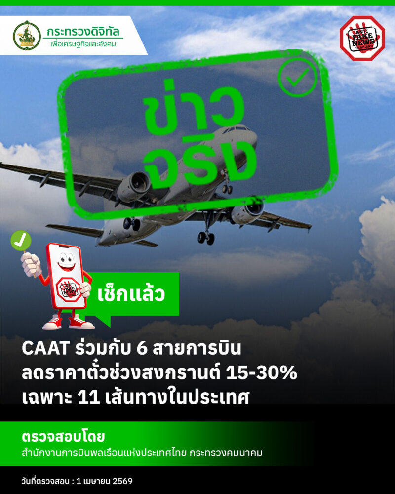 สำหรับอันดับ 1 เป็นข่าวจริง : เรื่อง “CAAT ร่วมกับ 6 สายการบิน ลดราคาตั๋วช่วงสงกรานต์ 15-30% เฉพาะ 11 เส้นทางในประเทศ” กระทรวงดีอี ได้ตรวจสอบกับ สำนักงานการบินพลเรือนแห่งประเทศไทย (CAAT) กระทรวงคมนาคม ยืนยันเป็น “ข่าวจริง” โดย CAAT ได้ติดตามสถานการณ์ราคาบัตรโดยสารอย่างใกล้ชิด โดยเฉพาะในช่วงเทศกาลที่มีความต้องการเดินทางสูง ซึ่งในช่วงเทศกาลสงกรานต์ 2569 CAAT ได้ประสานความร่วมมือกับสายการบินในการเพิ่มจำนวนที่นั่งและลดภาระค่าใช้จ่ายของประชาชน เพื่อให้การเดินทางเป็นไปอย่างเหมาะสมและเป็นธรรม