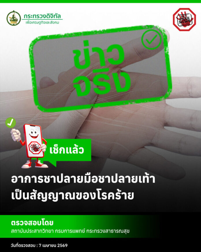 สำหรับอันดับ 1 เป็นข่าวจริง : เรื่อง “อาการชาปลายมือชาปลายเท้า เป็นสัญญาณของโรคร้าย” กระทรวงดีอี ได้ตรวจสอบร่วมกับ สถาบันประสาทวิทยา กรมการแพทย์ กระทรวงสาธารณสุข ยืนยันเป็น “ข่าวจริง” อาการชาเป็นสิ่งที่พบได้บ่อยและส่วนใหญ่มักไม่อันตราย เช่น ชาจากการนั่งหรือนอน ทับแขนหรือขานาน ๆ ซึ่งเป็นเพียงชั่วครู่และหายไปเอง แต่บางลักษณะอาจเป็นสัญญาณของโรคที่ควรปรึกษาแพทย์ ได้แก่