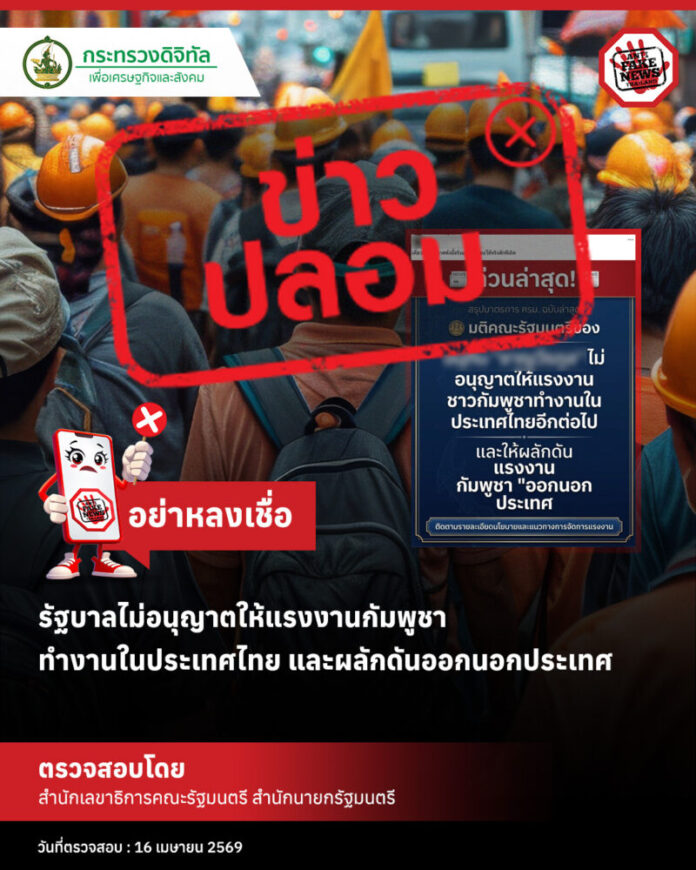 ข่าวปลอม “รัฐบาลไม่อนุญาตแรงงานกัมพูชาทำงานในไทย และผลักดันออกนอกประเทศ”