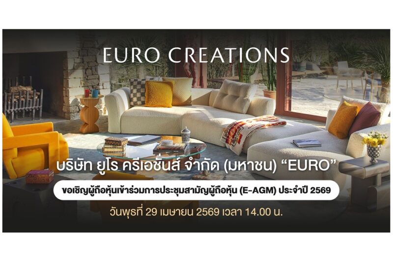 บรรดาแฟนคลับ บมจ. ยูโร ครีเอชั่นส์ (EURO) ผู้เชี่ยวชาญด้าน Luxury Lifestyle and Wellness Living Solutions เตรียมตัวให้พร้อม!!! ในการเข้าร่วมประชุมสามัญผู้ถือหุ้นประจำปี 2569 ผ่านสื่ออิเล็กทรอนิกส์เท่านั้น (E-AGM) ในวันพุธที่ 29 เมษายน 2569 เวลา 14.00 น. เพื่อร่วมโหวตมติการจ่ายเงินปันผลสำหรับผลการดำเนินงานประจำปี 2568 ให้แก่ผู้ถือหุ้นในอัตรา 0.25 บาทต่อหุ้น โดยกำหนดวันที่มีสิทธิรับเงินปันผล (Record Date) วันที่ 12 มีนาคม 2569 และกำหนดจ่ายเงินปันผลในวันที่ 21 พฤษภาคม 2569 สำหรับผลการดำเนินงานที่แข็งแกร่งในปีนี้มาจากความเชี่ยวชาญของ EURO ในการนำเสนอสินค้าและบริการระดับลักชัวรีอย่างครบวงจร พร้อมเดินหน้าพัฒนาสินค้า และการบริการอย่างต่อเนื่อง…งานนี้เชิญชวนผู้ถือหุ้นเข้าร่วมประชุม มาอัพเดทข้อมูลบริษัท ห้ามพลาด!แล้วพบกัน!