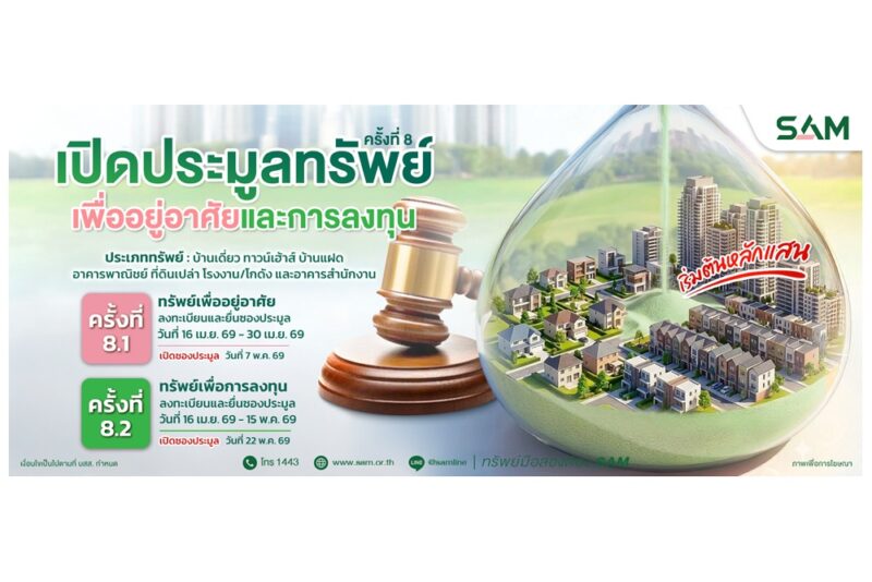 บริษัท บริหารสินทรัพย์สุขุมวิท จำกัด (บสส.) หรือ SAM เดินหน้าพันธกิจ “ส่งมอบโอกาสเพื่อคนไทย เริ่มต้นใหม่อย่างยั่งยืน” เปิดประมูลทรัพย์สินรอการขาย (NPA) ทำเลศักยภาพทั่วประเทศ รองรับทั้งการอยู่อาศัยและการลงทุน ครอบคลุมหลายประเภท ในช่วงเดือนพฤษภาคม 2569 โดยนำทรัพย์ออกประมูลรวม 53 รายการ มูลค่ารวมกว่า 154 ล้านบาท โดยทรัพย์ที่นำออกประมูลประกอบด้วย ที่ดินเปล่า ทาวน์เฮ้าส์ บ้านเดี่ยว บ้านแฝด อาคารพาณิชย์ อาคารสำนักงาน ในราคาพิเศษไม่เกิน 20 ล้านบาทและทรัพย์ประเภท โรงงาน/โกดัง เพื่อการลงทุนและต่อยอดธุรกิจ มูลค่าสูงกว่า 20 ล้านบาท