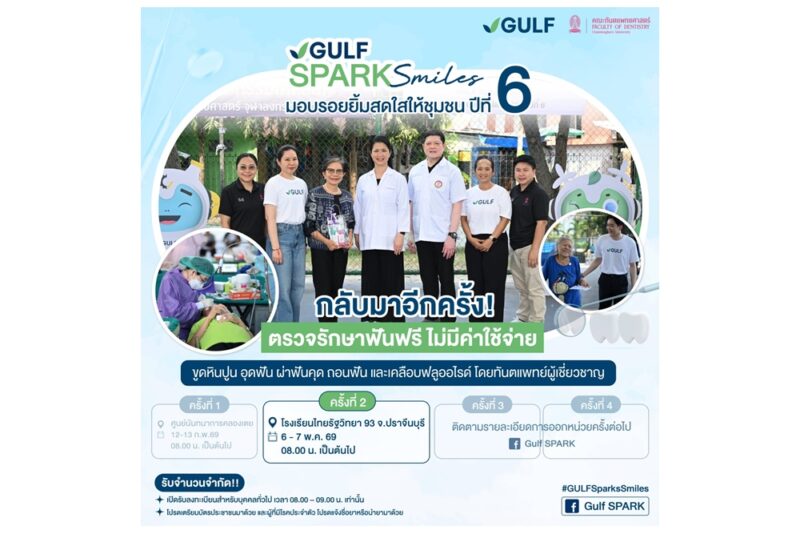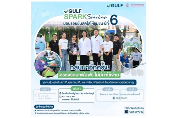 บริษัท กัลฟ์ ดีเวลลอปเมนท์ จำกัด (มหาชน) หรือ GULF จับมือ คณะทันตแพทยศาสตร์ จุฬาลงกรณ์มหาวิทยาลัย ยกระดับคุณภาพชีวิตชุมชนและสังคมไทยอย่างต่อเนื่อง นำโครงการ “GULF Sparks Smiles มอบรอยยิ้มสดใสให้ชุมชน ปี 6 ครั้งที่ 2” ปักหมุดลงพื้นที่ให้บริการทันตกรรมเชิงรุกแก่ประชาชน โดยไม่มีค่าใช้จ่าย ณ โรงเรียนไทยรัฐวิทยา 93 (บ้านลาดตะเคียน) อ.กบินทร์บุรี จ.ปราจีนบุรี ในวันที่ 6 – 7 พฤษภาคม 2569 สำหรับผู้สนใจเข้ารับบริการแบบ Walk-in สามารถลงทะเบียนได้ในวันที่ 6 พฤษภาคม 2569 ระหว่างเวลา 08.00 – 09.00 น. เท่านั้น (รับจำนวนจำกัด)