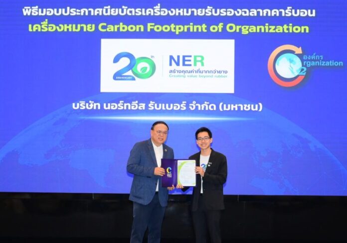 นายจิรายุส จึงธนสมบูรณ์ ผู้ช่วยประธานเจ้าหน้าที่บริหาร บริษัท นอร์ทอีส รับเบอร์ จำกัด (มหาชน) หรือ NER ผู้ผลิตและจำหน่ายผลิตภัณฑ์ยางสำหรับอุตสาหกรรมยานยนต์ทั้งในและต่างประเทศ เป็นตัวแทนเข้ารับเกียรติบัตรเครื่องหมายคาร์บอนฟุตพริ้นท์ขององค์กร ตอกย้ำความมุ่งมั่นด้านการดำเนินธุรกิจอย่างยั่งยืน ซึ่งสะท้อนถึงการบริหารจัดการการปล่อยก๊าซเรือนกระจกอย่างเป็นระบบและมีประสิทธิภาพ แสดงให้เห็นถึงความตั้งใจของบริษัทฯ ในการพัฒนากระบวนการผลิตให้เป็นมิตรต่อสิ่งแวดล้อม ครอบคลุมตั้งแต่การคัดเลือกวัตถุดิบ การเพิ่มประสิทธิภาพการใช้พลังงาน ตลอดจนการนำเทคโนโลยีสะอาดมาใช้เพื่อลดการปล่อยก๊าซเรือนกระจกในทุกขั้นตอนของห่วงโซ่อุปทาน