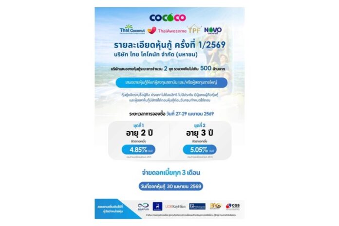 บริษัท ไทย โคโคนัท จำกัด (มหาชน) หรือ COCOCO ฮอตต่อเนื่อง! เดินหน้าเสนอขายหุ้นกู้ ดอกเบี้ย 4.85–5.05% อายุ 2–3 ปี เปิดจอง 27–29 เม.ย.นี้ หวังเสริมแกร่งการเงิน รองรับแผนขยายธุรกิจแบบจัดเต็ม งานนี้บอกเลยกระแสแรง นักลงทุนให้ความสนใจล้นหลาม จับตาใกล้ชิด เพราะยีลด์น่าสนใจ บวกกับพื้นฐานธุรกิจยังโตต่อเนื่อง โดยเฉพาะกลุ่มสินค้าเพื่อสุขภาพที่ยังคงเป็นเทรนด์มาแรงในตลาดโลก