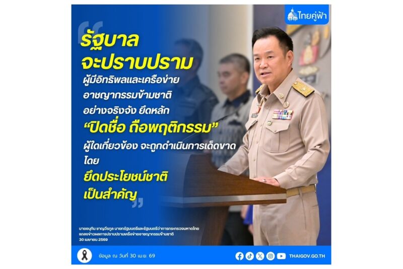 นายกฯ ยืนยันรัฐบาลเดินหน้าปราบปรามผู้มีอิทธิพลและเครือข่ายอาชญากรรมข้ามชาติอย่างจริงจังและต่อเนื่อง ยึดหลักการ “ปิดชื่อ ถือพฤติกรรม” ผู้ใดที่มีส่วนเกี่ยวข้องกับการกระทำความผิด จะถูกจะดำเนินการทางกฎหมายอย่างเด็ดขาด โดยยึดประโยชน์ของประเทศชาติเป็นสำคัญ