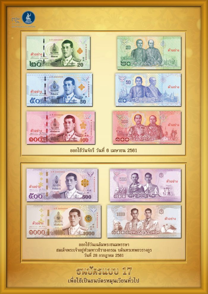 นายวิรไท สันติประภพ ผู้ว่าการ ธนาคารแห่งประเทศไทย แถลงข่าวว่า ธนาคารแห่งประเทศไทย ได้รับพระราชทานพระราชานุญาตจากสมเด็จพระเจ้าอยู่หัวมหาวชิราลงกรณ บดินทรเทพยวรางกูร ให้จัดพิมพ์ธนบัตรแบบใหม่ แบบ 17 เพื่อนำออกใช้เป็นธนบัตรหมุนเวียน